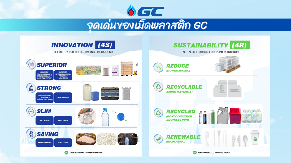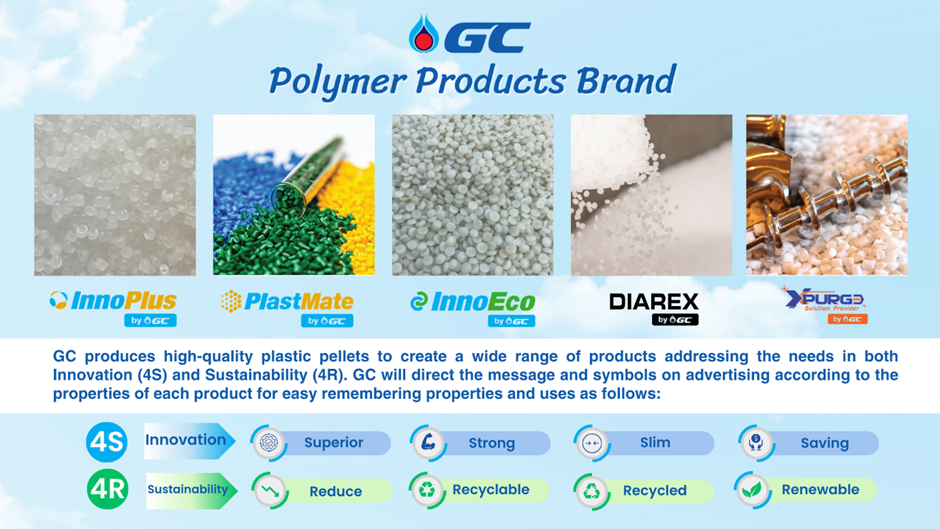 GC is the leading plastic resin manufacturer in Thailand, committed to develop products that serve diverse industry needs. With a strong focus on innovation (4S) and sustainability (4R), GC utilizes advanced production processes in plastic resin plants and recycled plastic resin plant to deliver high-quality products that ensure both efficiency and environmental responsibility.