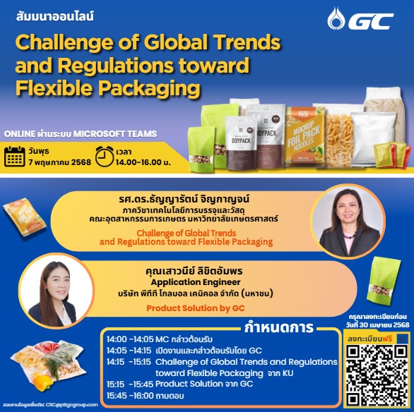 On May 7, 2025, PTT Global Chemical Public Company Limited (GC) hosted an online seminar titled “Challenge of Global Trends and Regulations toward Flexible Packaging.” The seminar aimed to educate and strengthen understanding among customers, partners, and plastic resin manufacturers on the current global trends in Flexible Packaging and the challenges of international regulations. The seminar provided valuable insights to help participants prepare for market shifts and adapt effectively to maintain sustainable competitiveness.