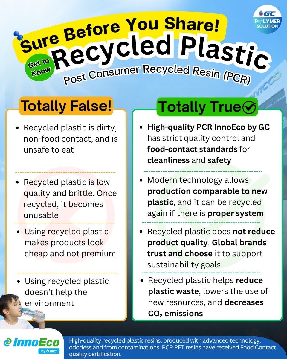 InnoEco by GC post-consumer recycled (PCR) resins are produced using advancedEuropean technology with stringent quality control throughout the process.These PCR resins are high-quality, consistent, odor-free, contaminant-free andcertified by international standards and trusted by leading global brands forsustainable packaging solutions: