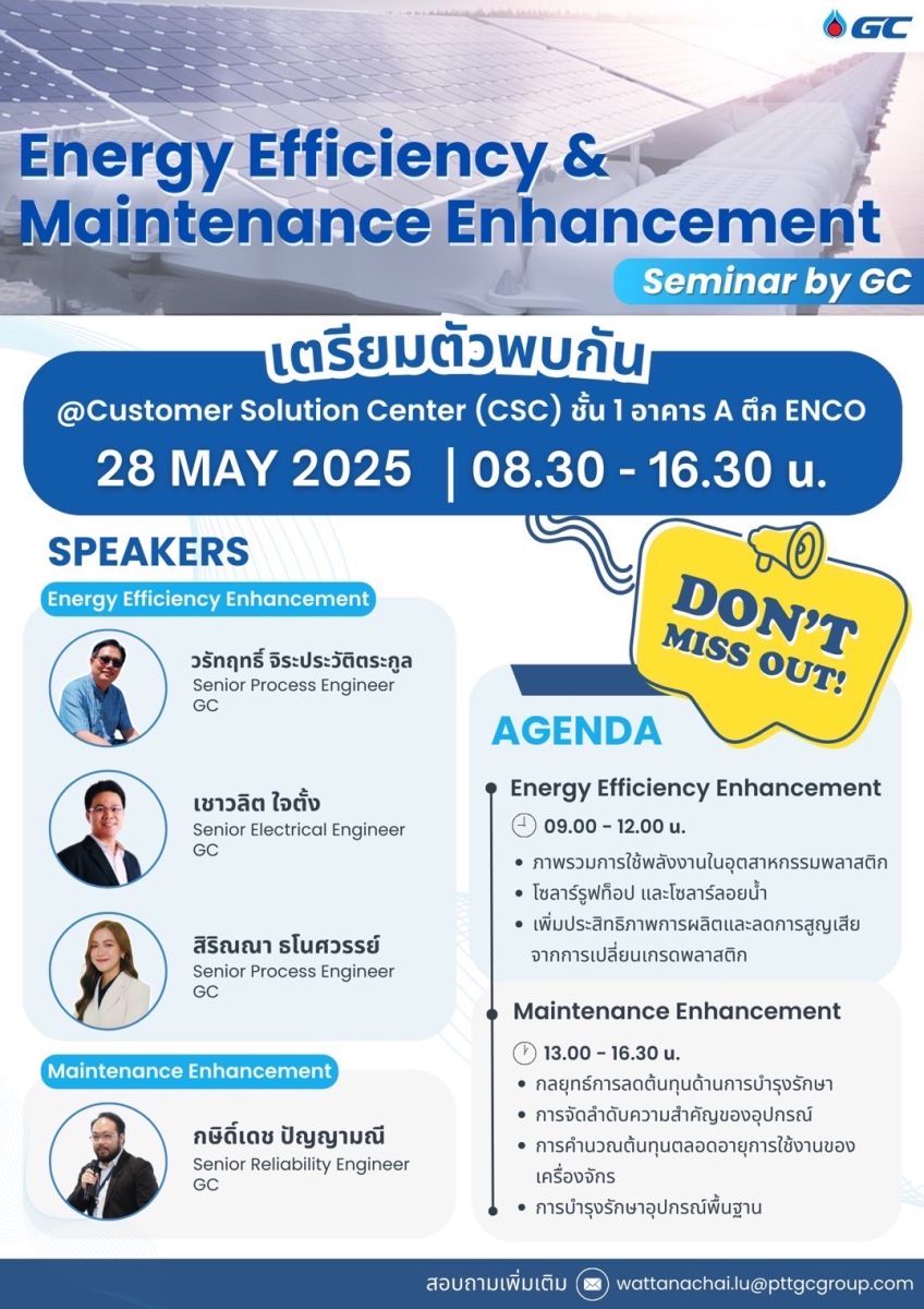 PTT Global Chemical Public Company Limited (GC) hosted a seminar under the topic “Energy Efficiency and Maintenance Enhancement” to provide knowledge and insights to over 30 customers who use GC’s plastic resins. The seminar aimed to share best practices in energy management and equipment maintenance to help improve efficiency, reduce costs, and support sustainability.