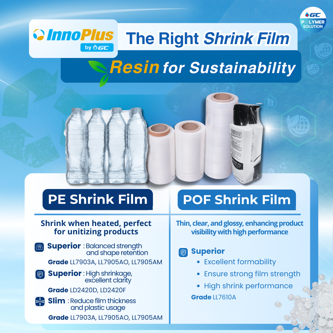 PE Shrink Film: Heat shrinkable film, perfect for bundling product (collation bundling shrink film). It offers toughness, durability, and excellent tear resistance, providing superior protection during delivery. PE resin under InnoPlus by GC brand offers high-performance resins that support superior properties and sustainability as follows: