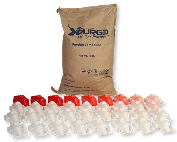 This special ingredient of X PURGE is effective which can prolong the life expectancy of your machines. Sometime, contaminants create scratching mark on the surfaces of your cylinders and screws. Especially, high hardness filler such as glass fiber is high abrasive material which will make deep hard to reach mark. When, dark color is used to product will be stuck within and hardly or cannot be removed.